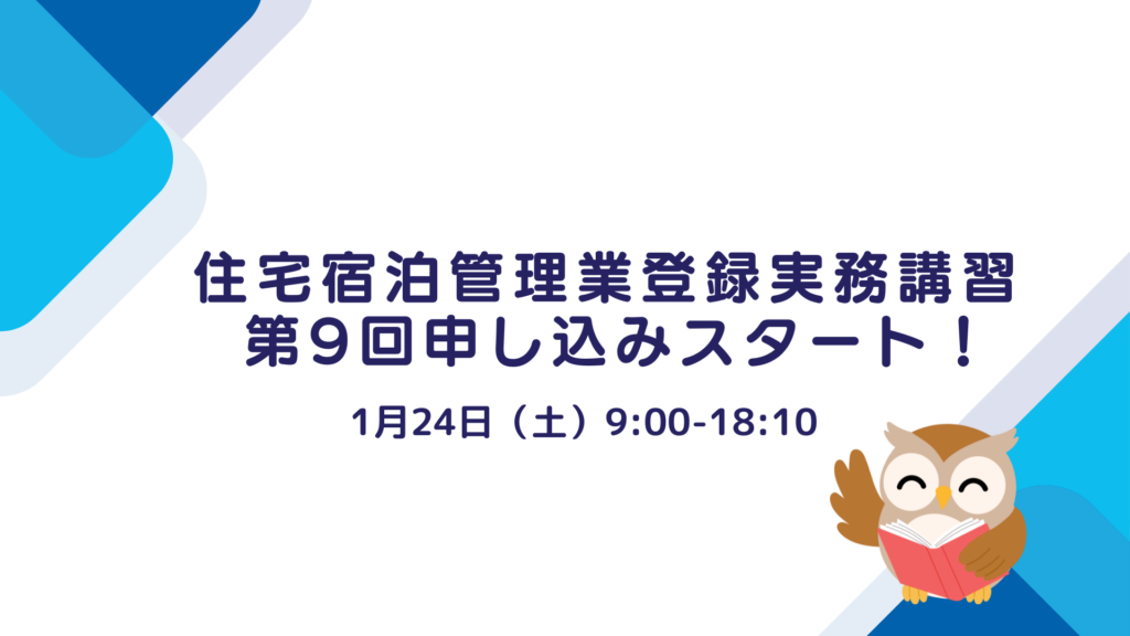 第9回〖1/24(土)開催〗住宅宿泊管理業登録実務講習|Zoom開催|18:10終了(民泊学院)